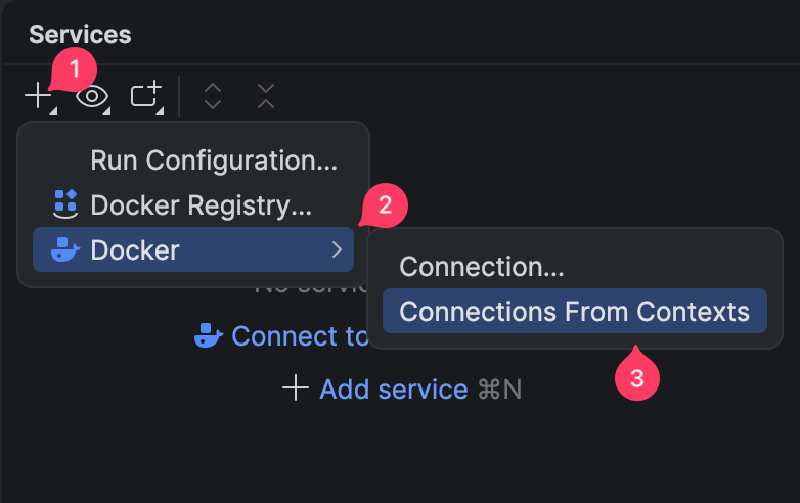 You should be able to click Connect to Docker with the option Detect executable paths automatically checked in the Docker pop-up window and it just works. If not, you can also try this method below and then right-click your Docker service and Connect.