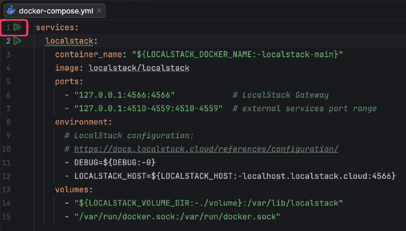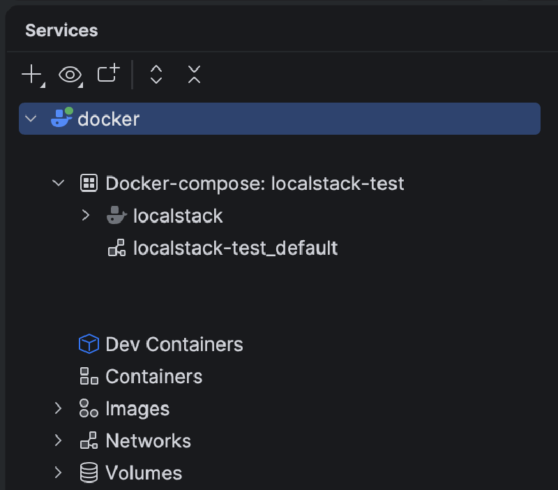 docker-compose.ymlin the root of your project folder. This was taken from LocalStacks official documentation found here.services: localstack: container_name: "${LOCALSTACK_DOCKER_NAME:-localstack-main}" image: localstack/localstack ports: - "127.0.0.1:4566:4566" # LocalStack Gateway - "127.0.0.1:4510-4559:4510-4559" # external services port range environment: # LocalStack configuration: # https://docs.localstack.cloud/references/configuration/ - DEBUG=${DEBUG:-0} volumes: - "${LOCALSTACK_VOLUME_DIR:-./volume}:/var/lib/localstack" - "/var/run/docker.sock:/var/run/docker.sock"Run docker compose